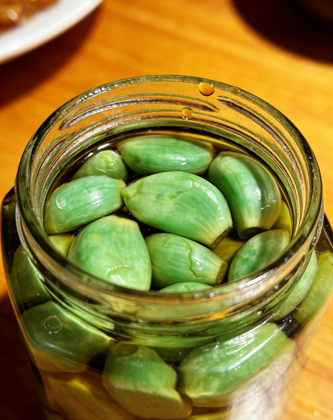 如果说粥是腊八的“当下”,那腊八蒜便是腊八为春节备下的“未来”。做法简单质朴:将白蒜瓣浸入清醋,封存坛中,交给时间。二十余日的等待后,蒜瓣渐渐变成翡翠般的碧绿。这坛中物,是中国人“日久生味”的生活智慧,也是餐桌上不可或缺的清脆酸甜。