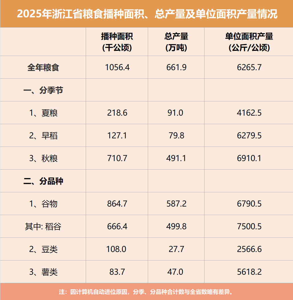 全国各地齐发力,每一寸土地都在为端稳 “中国饭碗” 悄悄使劲儿,耕出满满安全感。在“七山一水二分田”的浙江,粮食生产虽受耕地资源限制,却以科技赋能、高效生态著称。2025年浙江省粮食播种面积达1584.6万亩,总产量132.4亿斤,单位面积产量417.7公斤/亩。三项指标均创近十年新高,其增量增幅在全国也位居中上游,近些年,浙江粮食每年都上一个新的台阶。这碗飘着米香豆韵的腊八粥,更藏着一组超给力的浙江粮食数据哦!