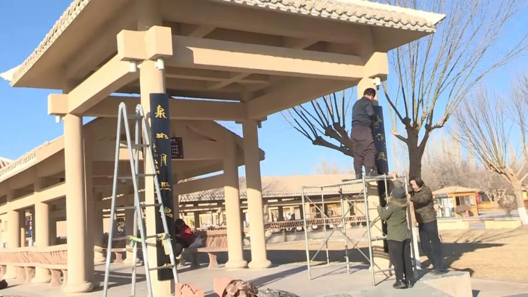2021年末,敦煌市委、市政府抽调诗词楹联等领域的专业人员,成立敦煌市楹联改造专班,启动实施敦煌市街区、景点及文化教育场所楹联牌匾改造提升工程。专班成立后迅速分工,一组负责收集整理敦煌文史资料与经典楹联,挖掘地域文化元素;另一组负责对接相关单位,协调改造范围、标准与进度安排。