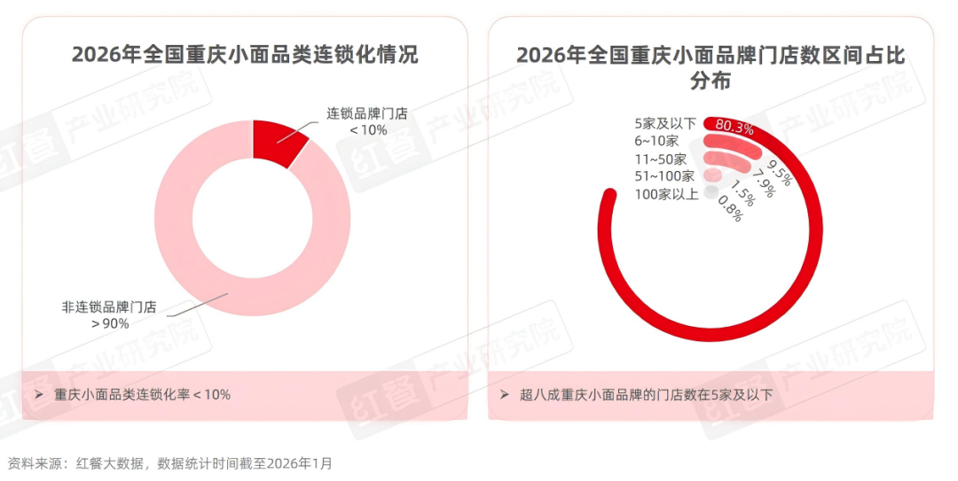 和面馆赛道类似,重庆小面当前以夫妻店、街边摊为主,连锁化和品牌规模化程度较低。红餐大数据显示,截至2026年1月,该品类连锁化率不足10%,80.3%的品牌门店数在5家及以下,100家以上的仅占0.8%。这既体现市场高度分散,也说明品牌化、连锁化升级潜力大。