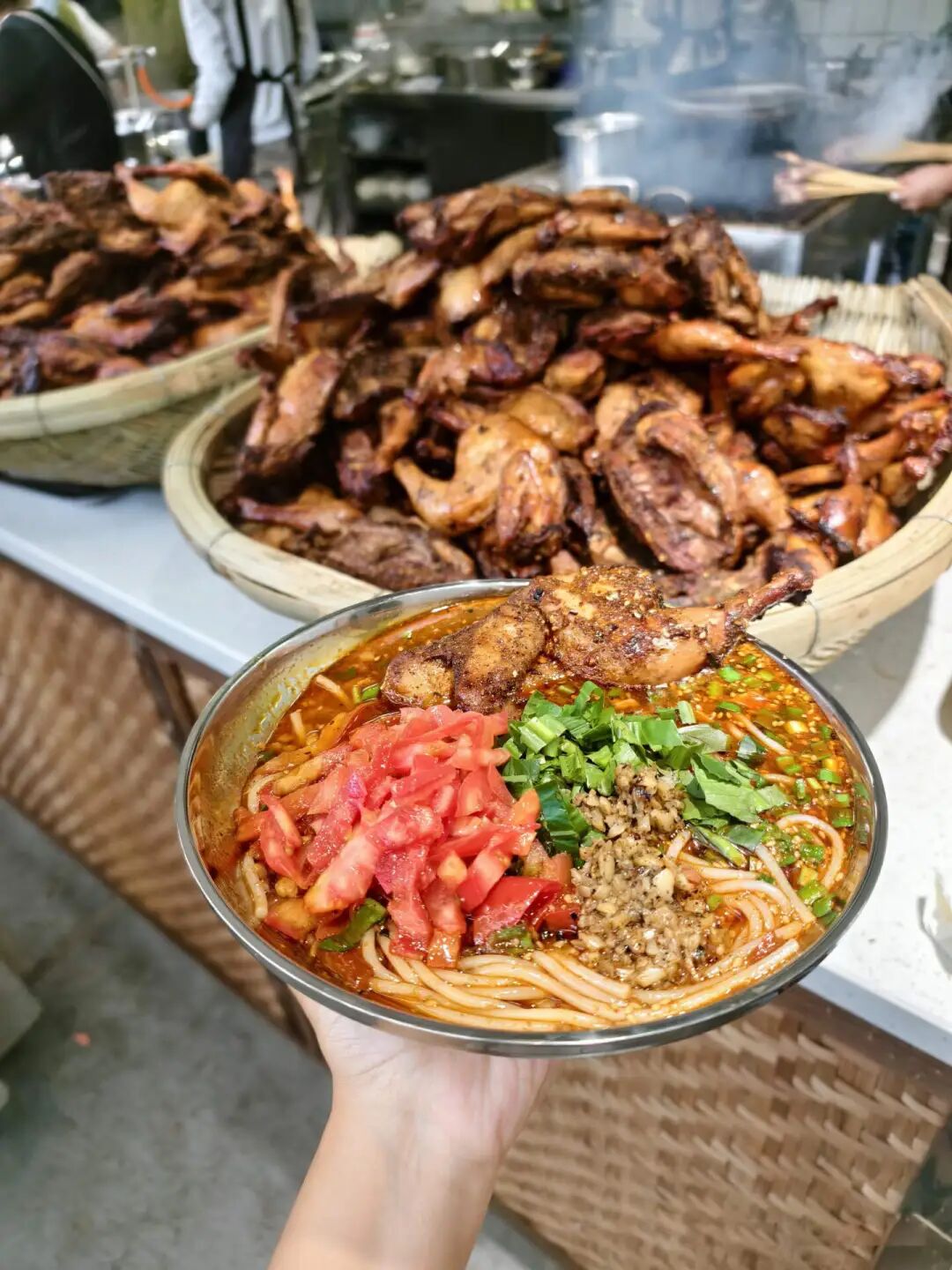 烤鸡米线的核心在于半只炭火烤鸡:明火炭烤让鸡皮金黄微焦,油脂析出后表皮香脆带炭香,既美味又极具视觉冲击力——半只鸡直接摆盘的造型,天然适合社交媒体传播,这是其走红的关键。
