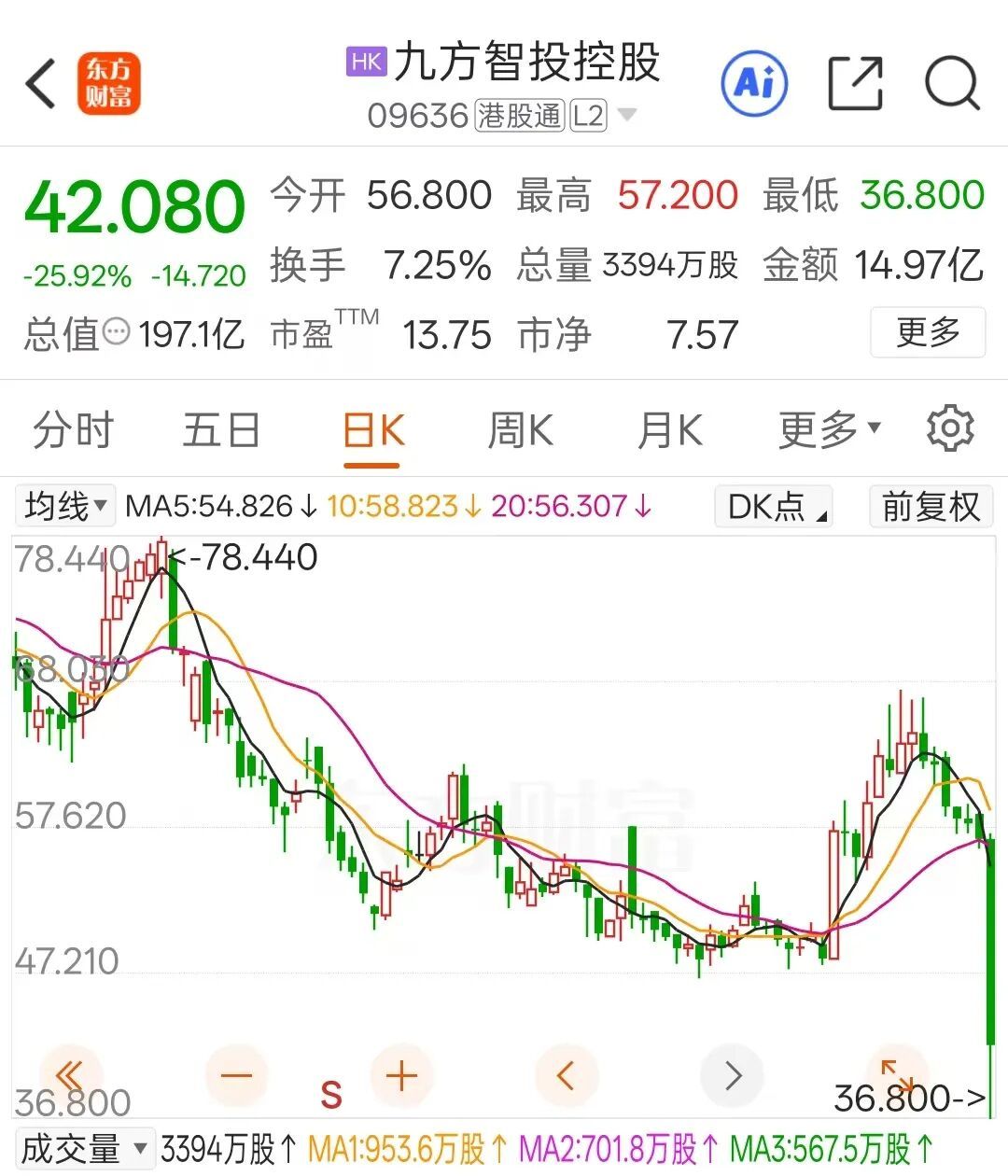 今日午后,港股上市公司九方智投控股股价突然大幅跳水,盘中跌幅一度超过35%,最终收盘时下跌26.16%。从目前的消息面来看,市场上并未出现明显的利空信息,公司方面也未就此次股价暴跌进行公开回应。