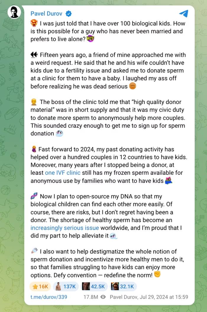这份精子的所有者正是Telegram创始人、身价近170亿美元的帕维尔·杜罗夫。