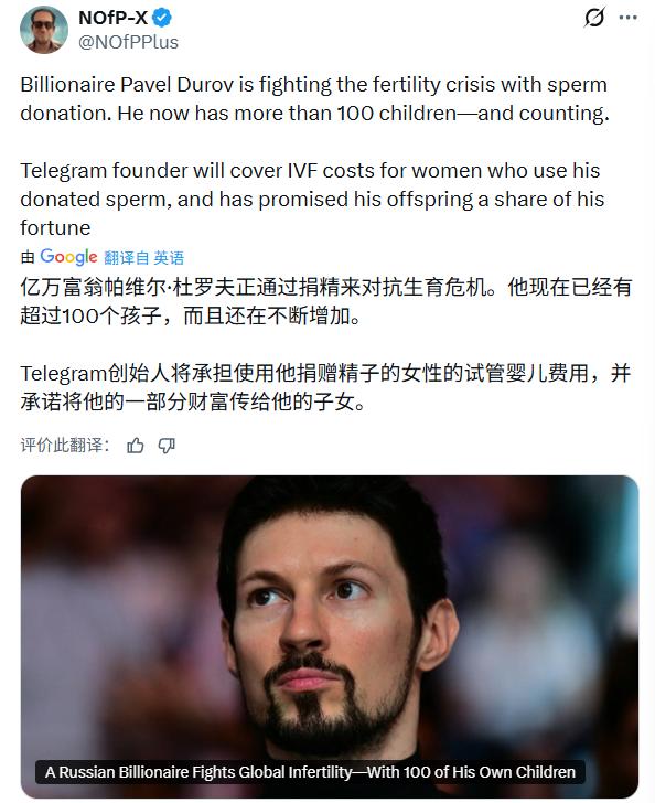 这并非普通的慈善捐赠。杜罗夫不仅为37岁以下使用其精子的女性承担全部试管婴儿费用,还在2025年6月宣布:所有经其精子诞生的子女,未来将平等分享他的亿万遗产。