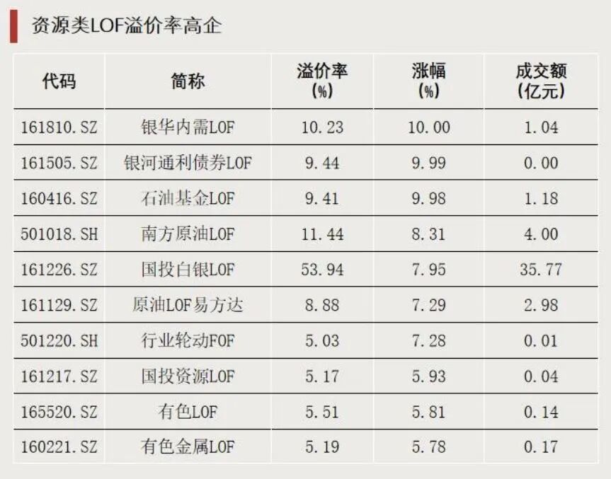 今日,多只资源类LOF大幅上涨,截至收盘,银华内需LOF、石油基金LOF等涨停,溢价率在9%以上;南方原油LOF上涨8.31%,溢价率超过11%;国投白银LOF上涨7.95%,溢价率高达53.94%。