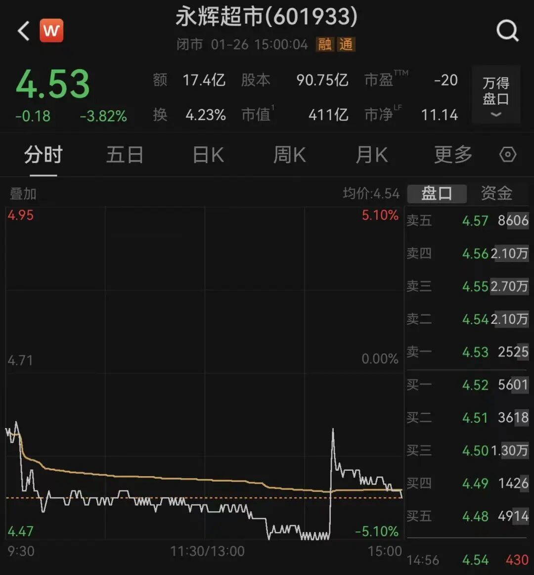 截至1月26日收盘,永辉超市股价下跌3.82%,报4.53元/股,最新总市值为411亿元。