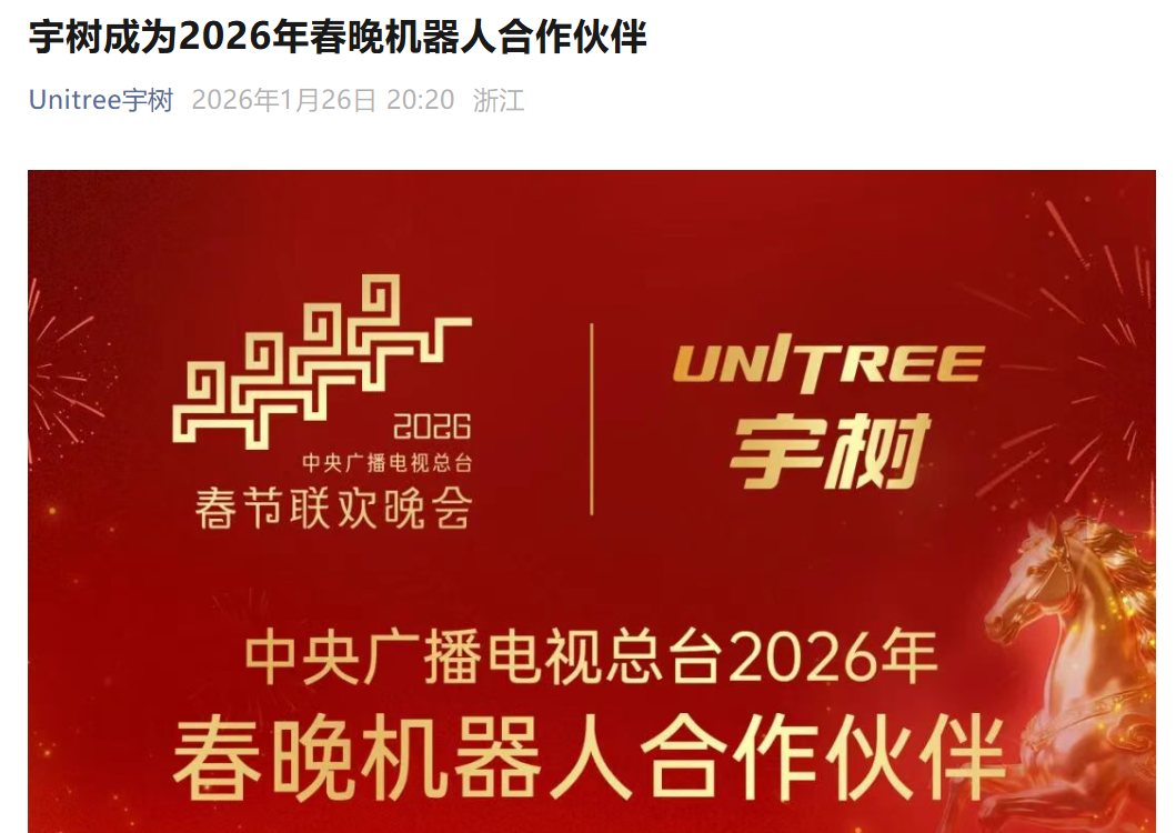 1月26日,宇树科技通过官方微信公众号宣布,已正式成为2026年中央广播电视总台春节联欢晚会的机器人合作伙伴。