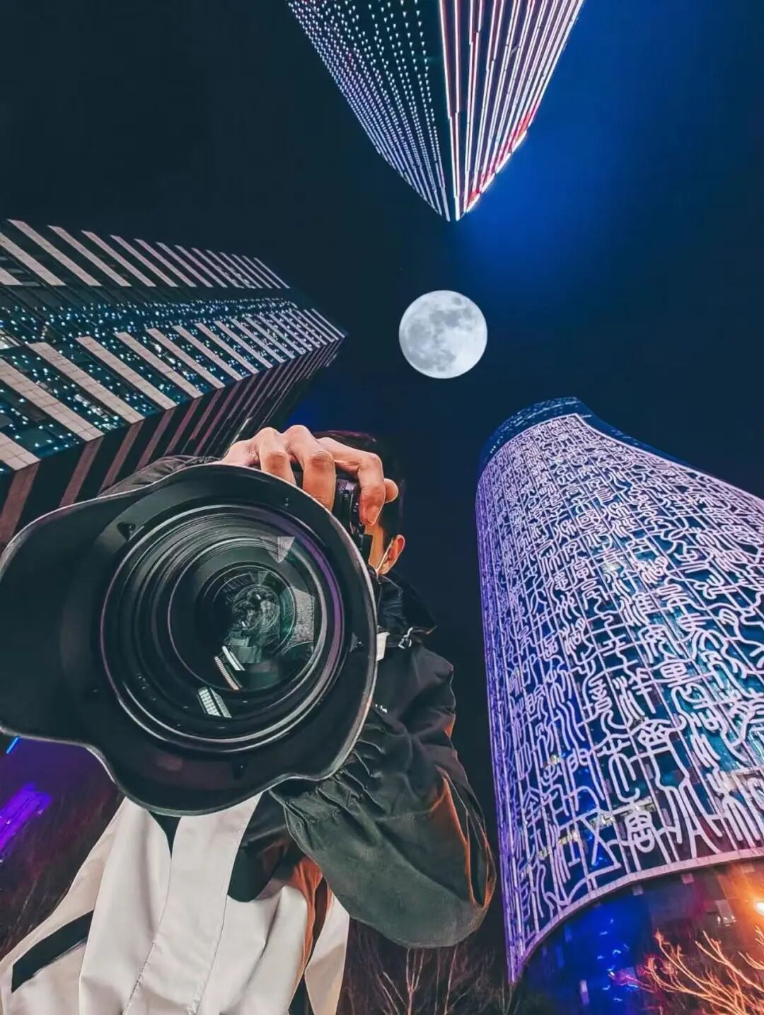 想拍出震撼同框效果,低角度仰拍是关键。将设备贴近地面,三栋大楼直插云霄的压迫感与张力便会呈现。