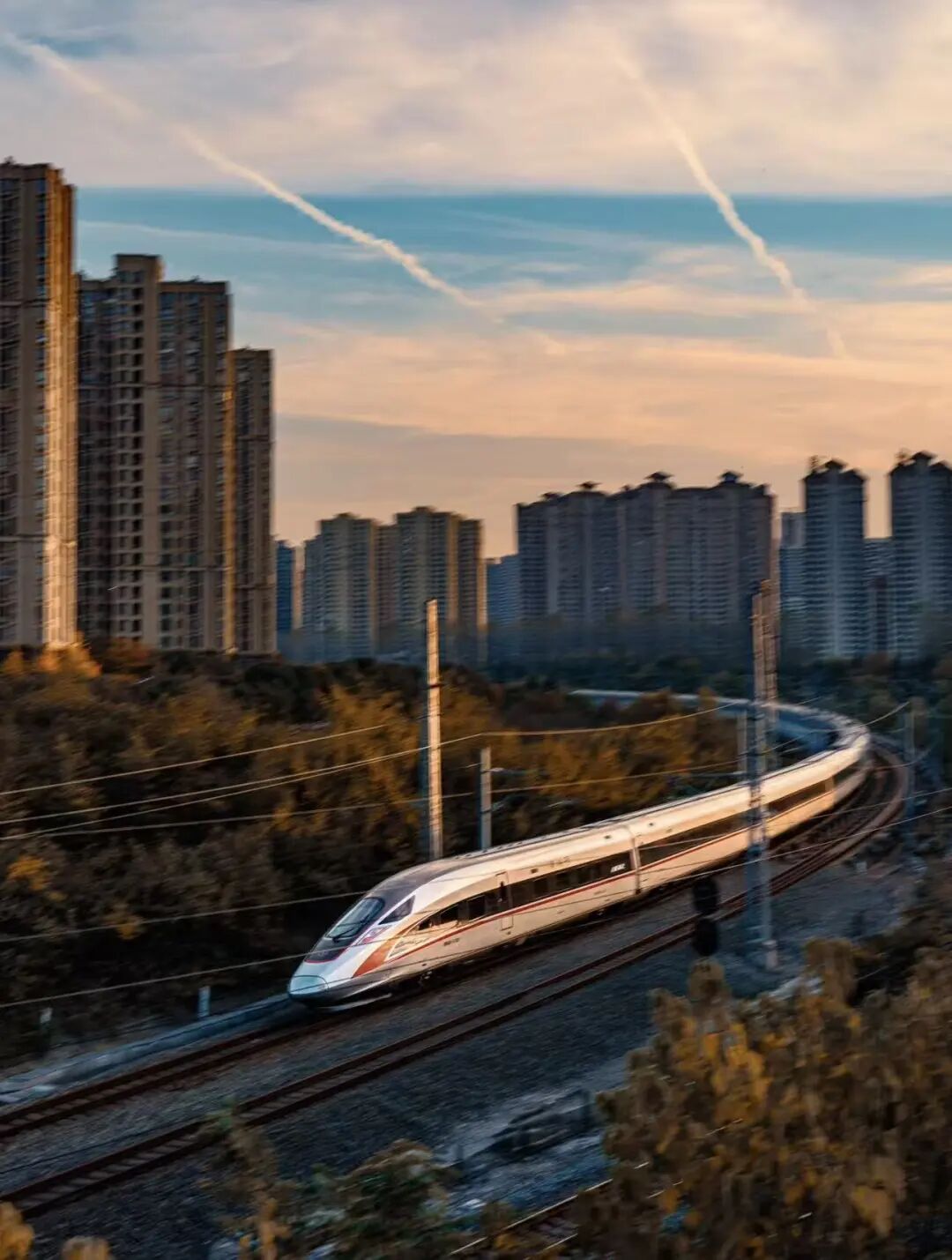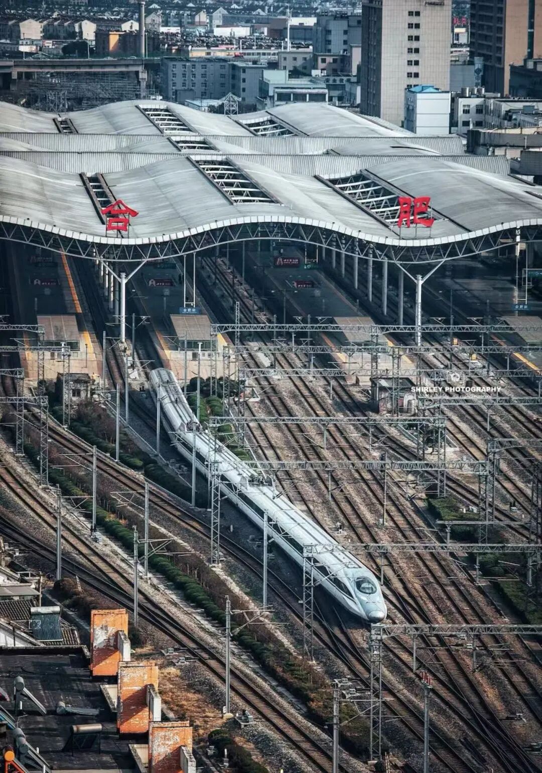 高铁从城市楼宇间驶过,划出优美弧线。日落时分,列车披着金晖穿行,宛如发光丝带。速度与弧度、钢铁与柔光交织,是记录现代合肥流动之美的绝佳画面。