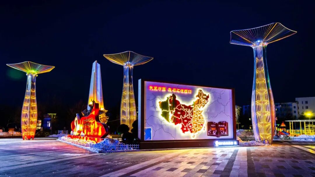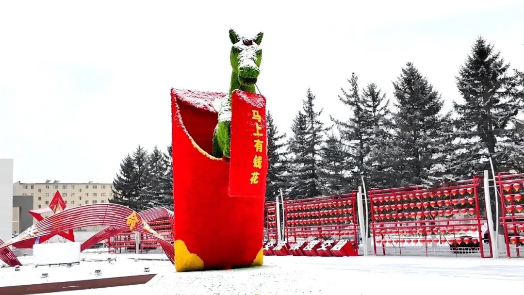 广场全景:用广角镜头捕捉广场的整体布局,冰雪装饰和打卡点相互映衬,展现出边境城市的独特风情。