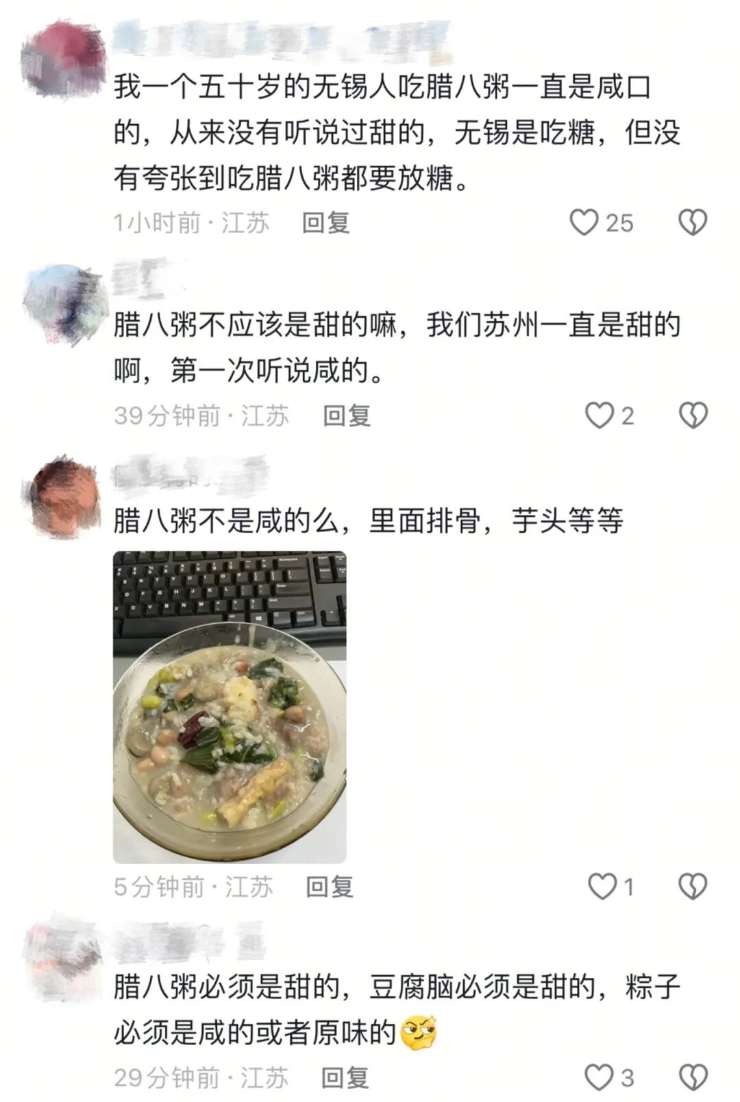 让人意外的是,和苏州相邻、常被认为口味偏甜的无锡,当地网友也站队咸口腊八粥。