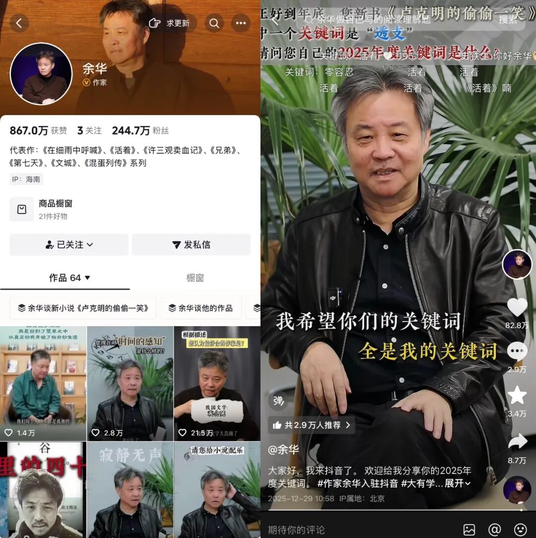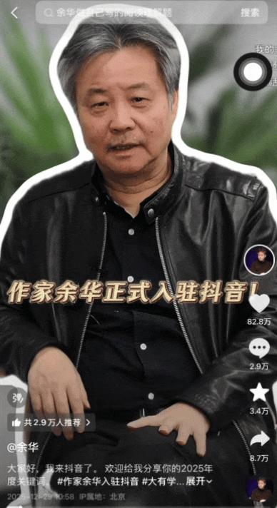 继莫言入驻小红书后,2025年12月29日,作家余华正式官宣入驻抖音平台。