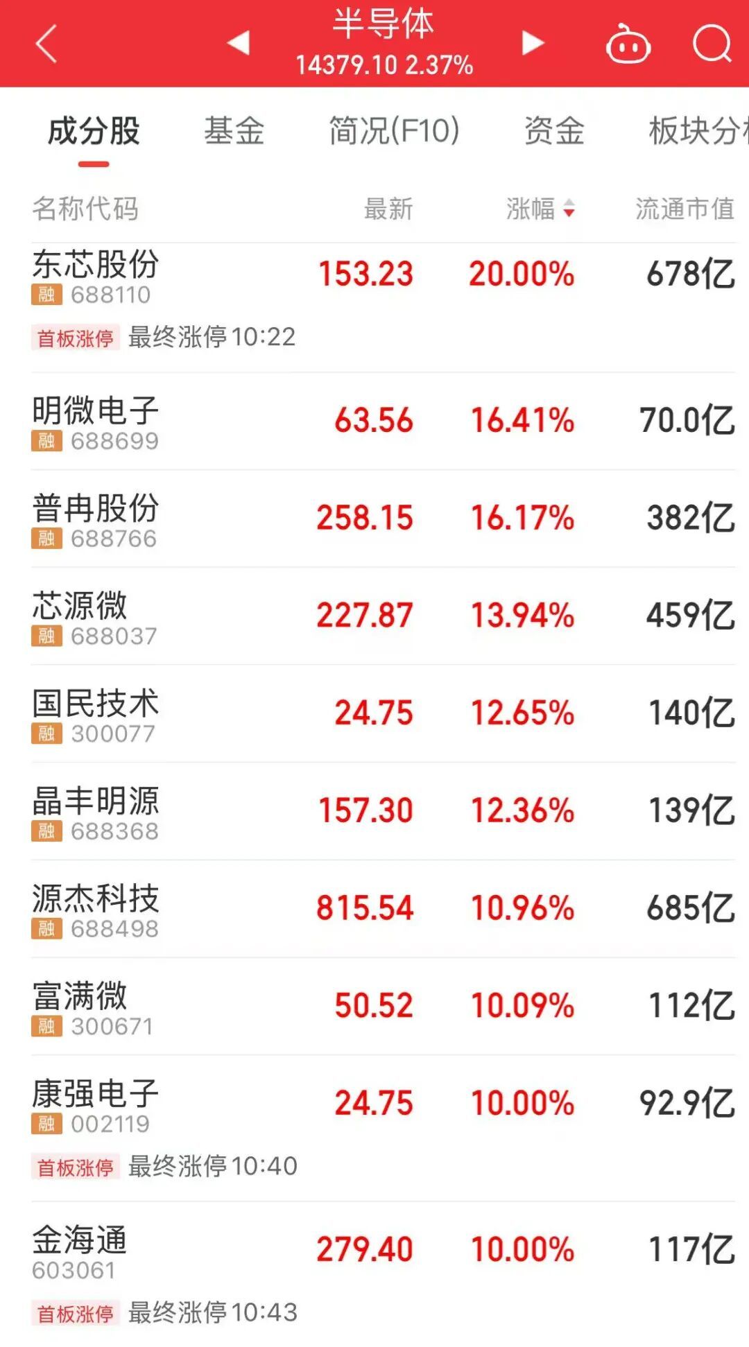 早盘半导体产业链表现活跃,存储芯片与半导体设备板块领涨,东芯股份20%涨停,普冉股份大涨16%,精智达涨超8%,上述个股股价均创历史新高。