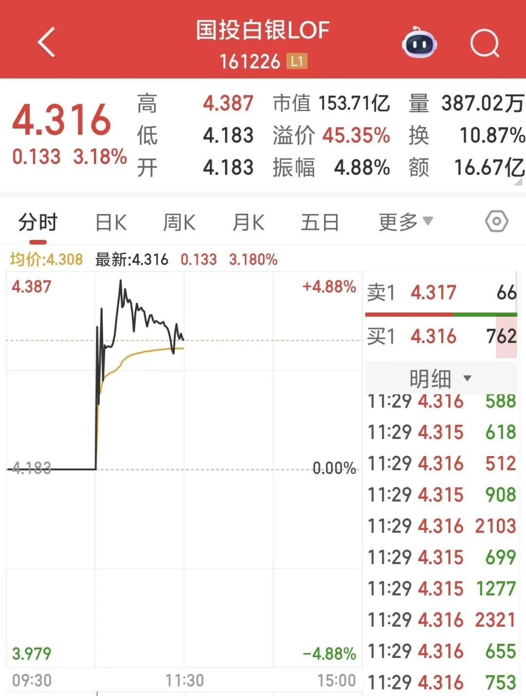 同花顺数据显示,1月27日国投白银LOF复牌后呈现冲高回落的走势,盘中交易价格最高达到4.387元,再次刷新历史纪录。截至当日上午收盘,该基金场内交易价格为4.316元,涨幅超过3%,溢价率更是超过45%。