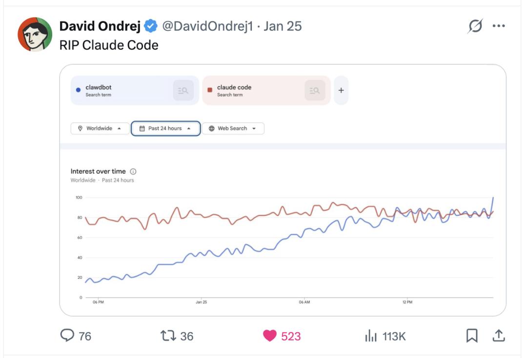 | Clawdbot 24小时内网络搜索量,图片来源于网络