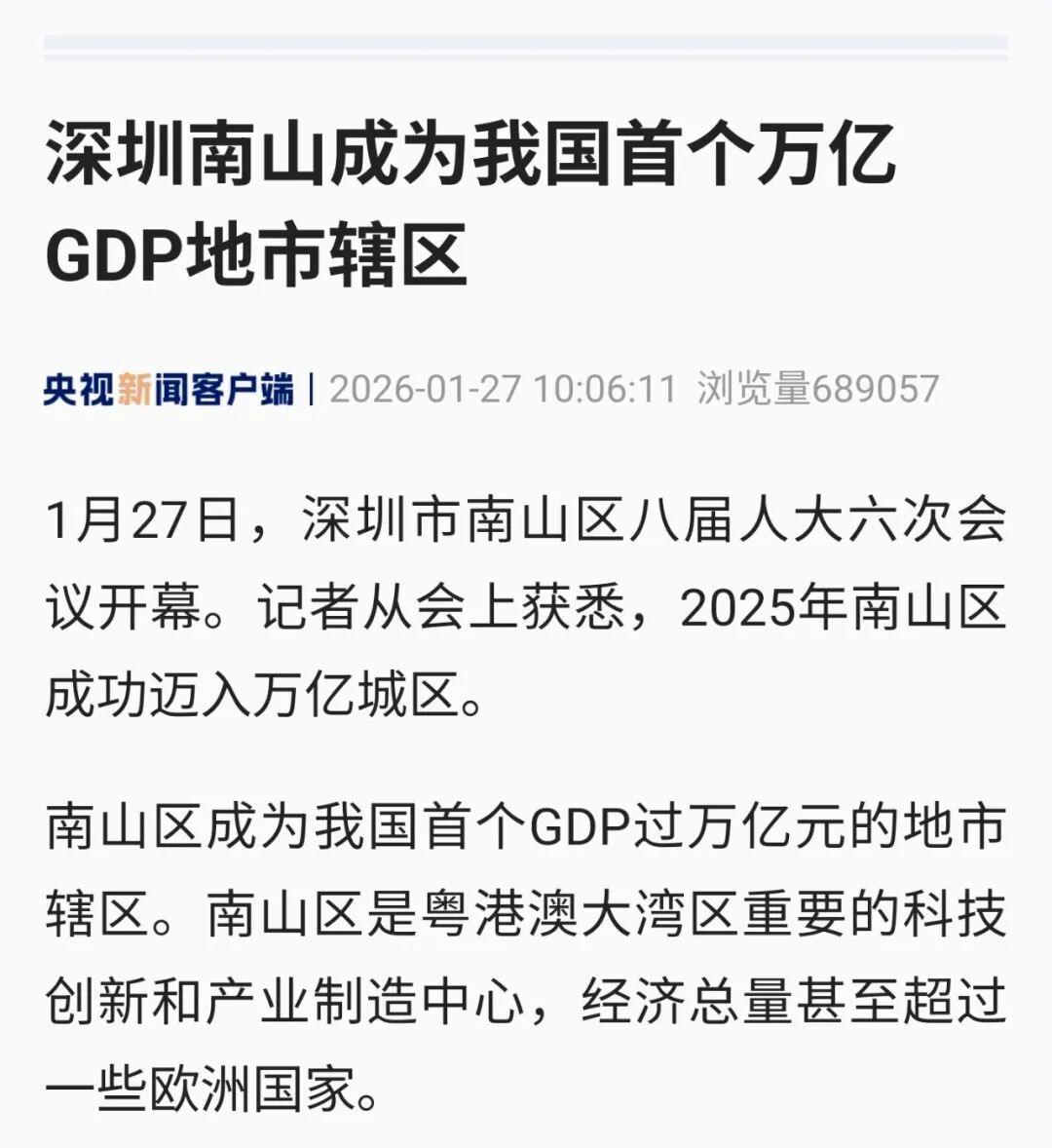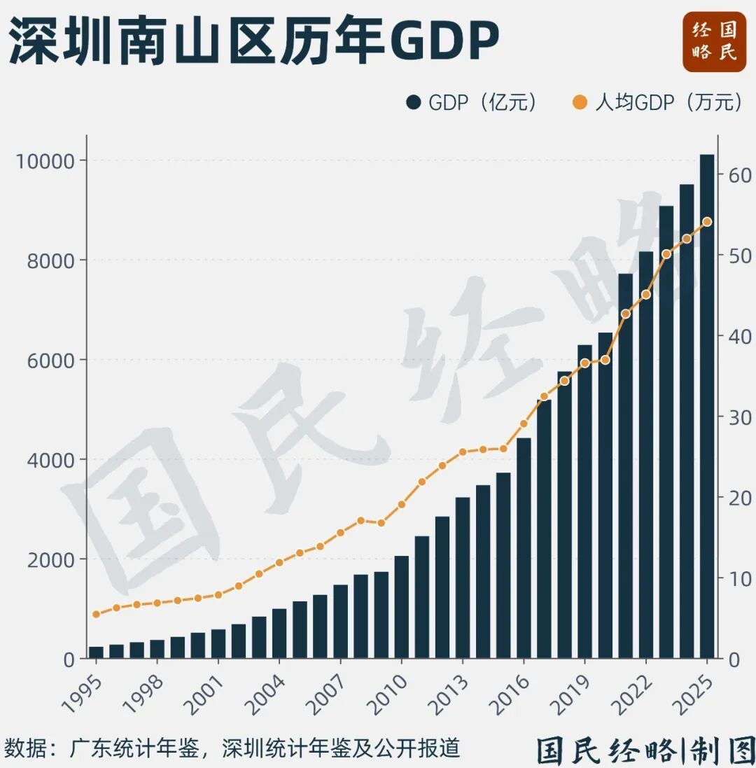 深圳市南山区人民代表大会传来消息,2025年该区GDP总量突破1万亿元,成为我国首个GDP超过万亿元的地市辖区。