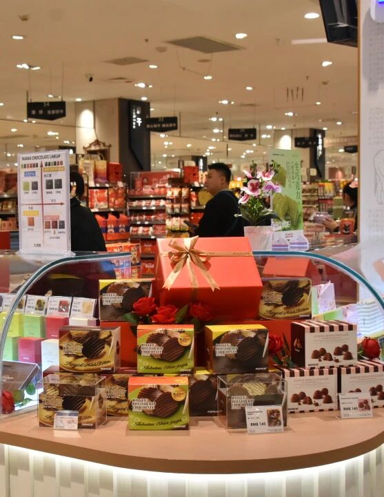 双楠店食品超市以“悦”为核心重构空间美学与商品呈现:商品端设立热门IP糖玩集合区,引入疯狂动物城、蜡笔小新等IP单品,精准捕捉亲子需求;打造铭店专区,汇集斯里兰卡红茶、法国饼干、日本巧克力等知名品牌,兼顾日常消费与品质赠礼;现切水果升级为环保精致包装的便携轻食,空运鲜花专区与日式点心礼盒丰富选择。空间端通过“中岛化”布局、日式纹理装饰与暖光氛围,营造通透精致的逛游场景,将购物从“目的性消费”转化为“沉浸式体验”,契合当代消费者对生活美学的追求。