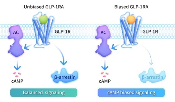 埃诺格鲁肽作为全球首个获批的cAMP偏向型GLP-1受体激动剂,与传统非偏向型药物不同,它能选择性激活cAMP信号通路,同时减少β-arrestin的募集。这种信号偏向性可避免受体脱敏与下调,使受体更多留存于细胞表面,维持治疗信号传导,是提升疗效与代谢获益的关键机制。