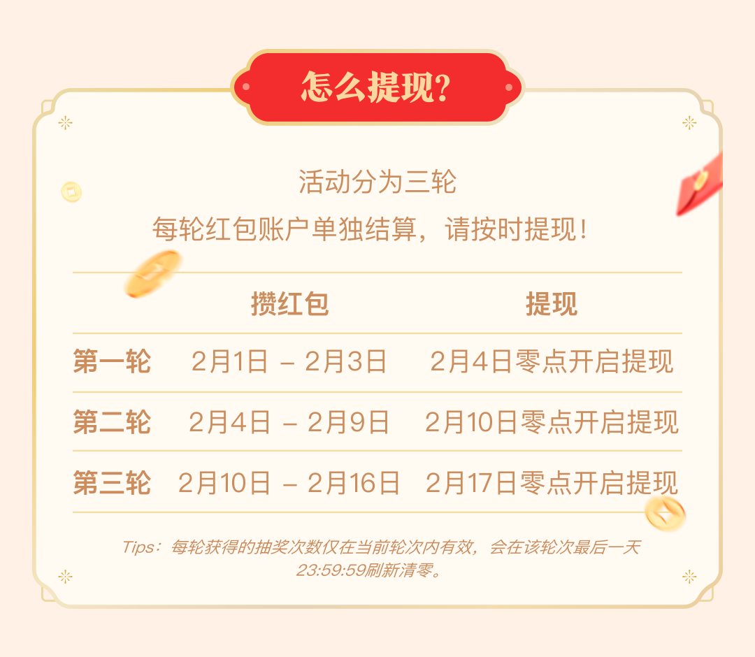 腾讯方面介绍,主会场活动分为3轮,2月4日零点、2月10日零点、2月17日零点后开启上一轮的红包现金提现。