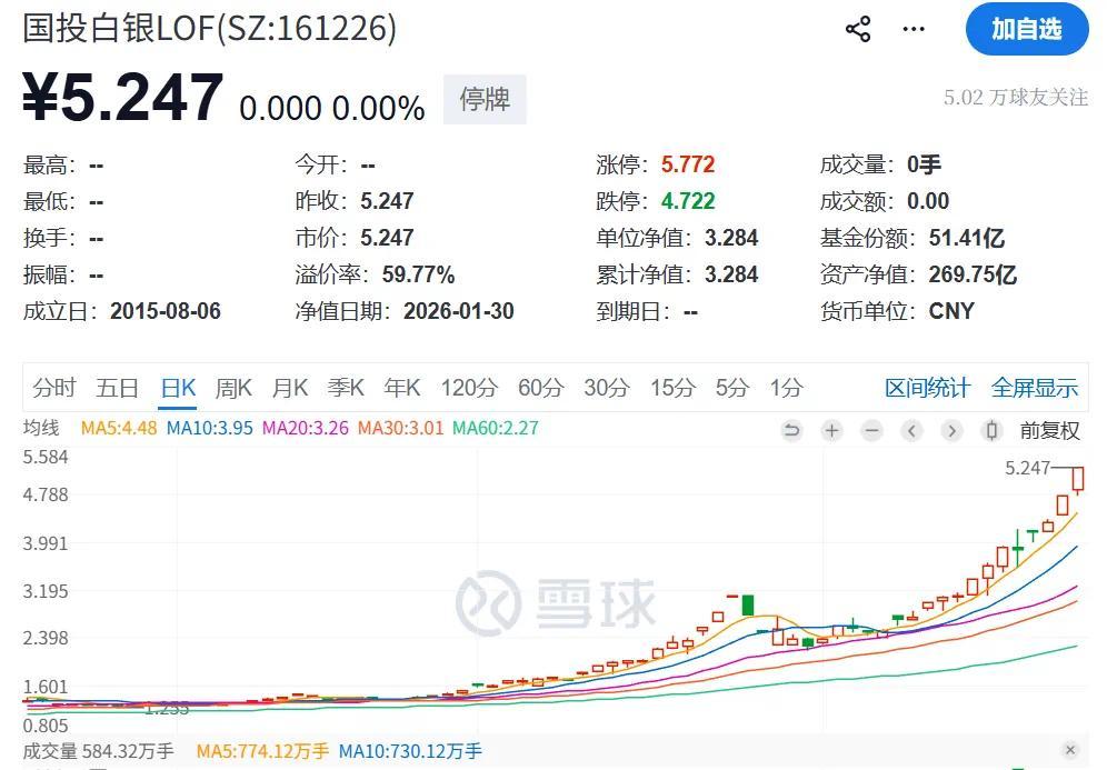 此前受国际银价暴涨影响,国投白银LOF受到市场高度关注。停牌前,该基金在二级市场已连续两个交易日涨停,最新收盘价为5.247元/份,较最新净值溢价约60%。
