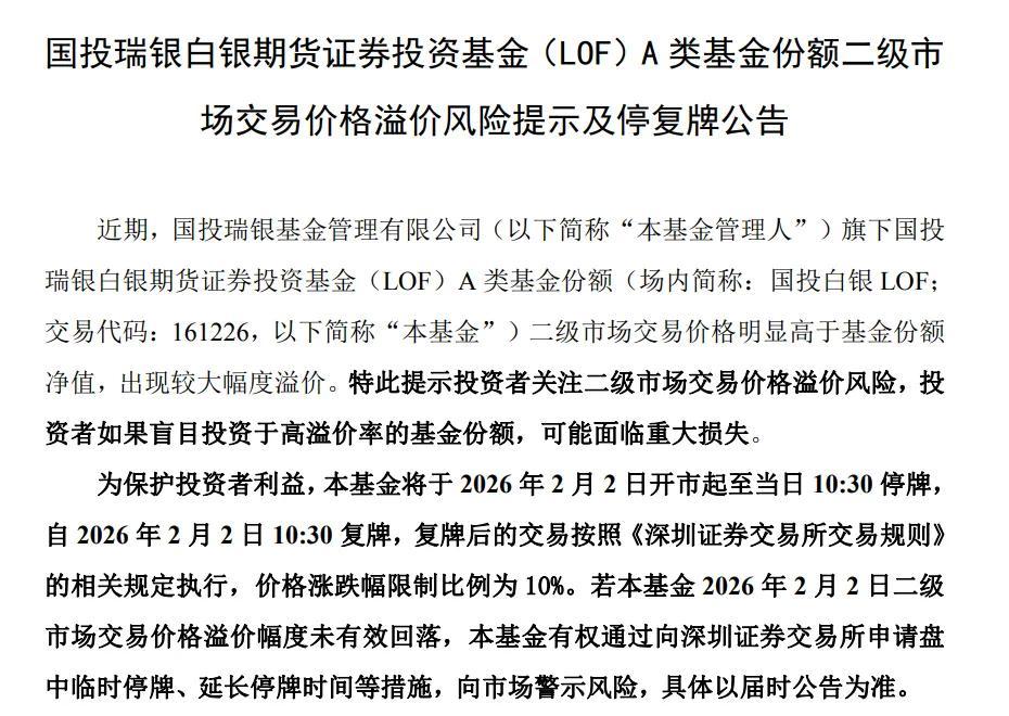国投白银LOF基金发布公告,宣布将于2026年2月2日开市起至当日10:30停牌,10:30起复牌。复牌后交易将遵循《深圳证券交易所交易规则》,价格涨跌幅限制比例为10%。若2月2日该基金二级市场交易价格溢价幅度未有效回落,基金有权向深交所申请盘中临时停牌或延长停牌时间以警示风险,具体以届时公告为准。