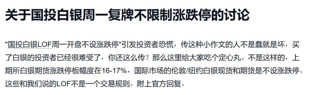 国投白银LOF的最新公告间接对谣言进行了澄清,明确指出基金价格涨跌幅限制比例为10%。