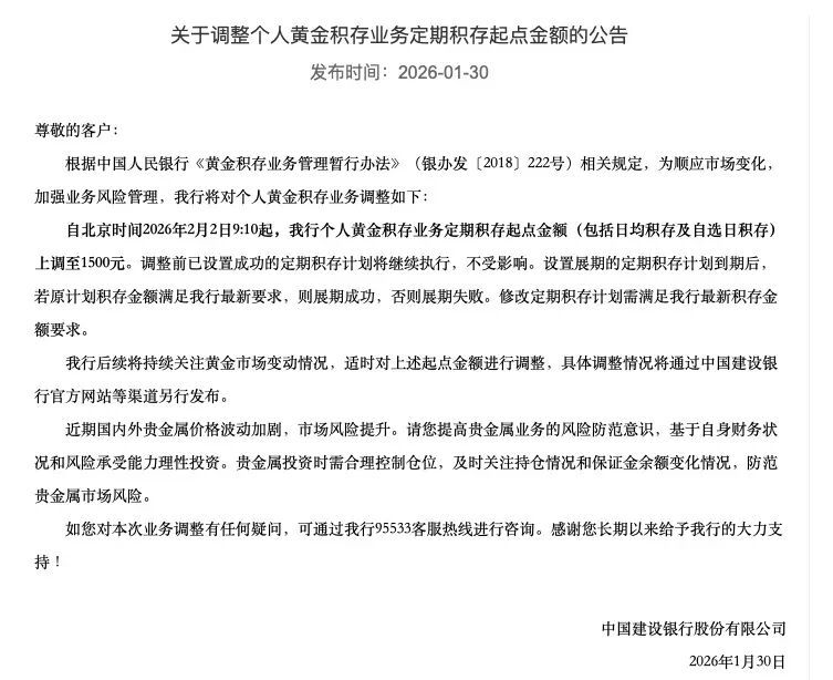 1月30日,建设银行公告调整个人黄金积存业务定期积存起点金额。自2月2日9:10起,该行个人黄金积存业务的定期积存起点金额(包括日均积存和自选日积存)上调至1500元。