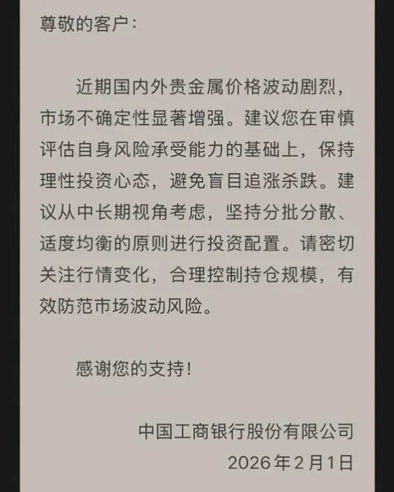 2月1日,工商银行旗下“工银金行家”公众号发布风险提示指出,当前国内外贵金属价格波动剧烈,市场不确定性明显上升。该行建议客户在充分评估自身风险承受能力的前提下,保持理性投资态度,避免盲目跟风操作。同时,建议客户从长期投资角度出发,遵循分批分散、适度均衡的配置原则,密切关注市场行情变化,合理控制持仓规模,以有效应对市场波动风险。