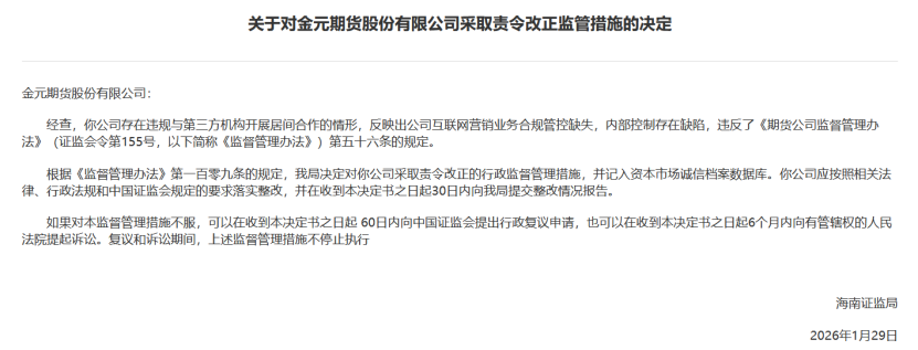 1月30日,海南证监局网站发布了关于金元期货及其相关人员的监管措施公告。海南证监局表示,经过核查,金元期货存在违规与第三方机构开展居间合作的情况,这表明公司在互联网营销业务的合规管控方面存在缺失,内部控制存在缺陷。依据相关规定,金元期货被采取了责令改正的行政监督管理措施。