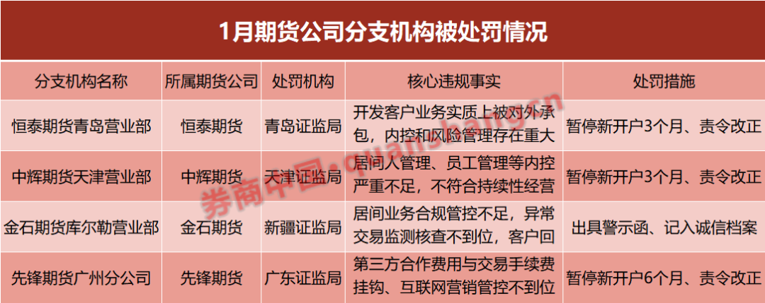 多家期货公司被监管部门“点名批评”,处罚的矛头直指居间业务、内部控制、互联网营销等核心违规领域,处罚措施既包括警示函、监管谈话这类柔性约束手段,更有暂停新开户等对业务开展有实质性影响的限制措施。