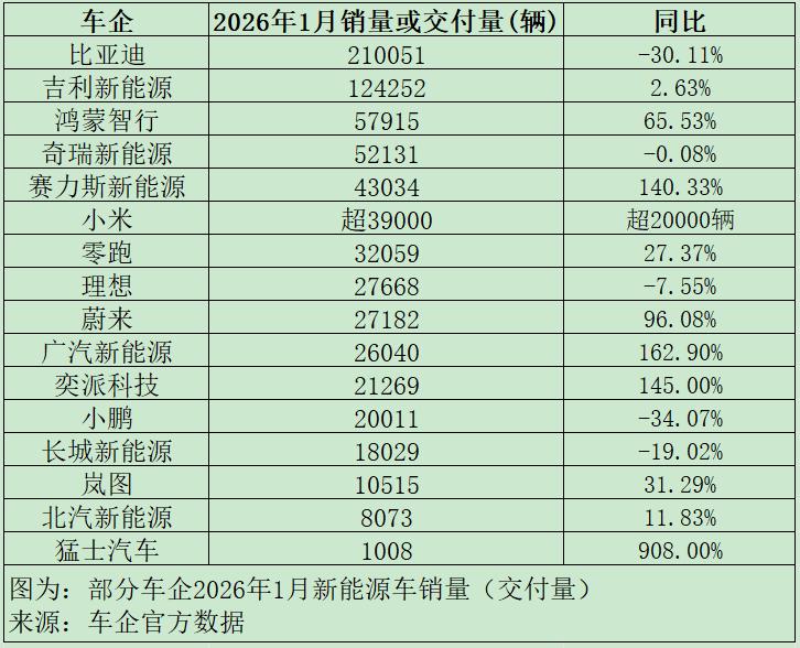 与比亚迪形成对比的是,1月多家新能源车企表现亮眼。其中,小米汽车1月交付量超3.9万辆,超越零跑汽车,首次摘得造车新势力月度销冠。
