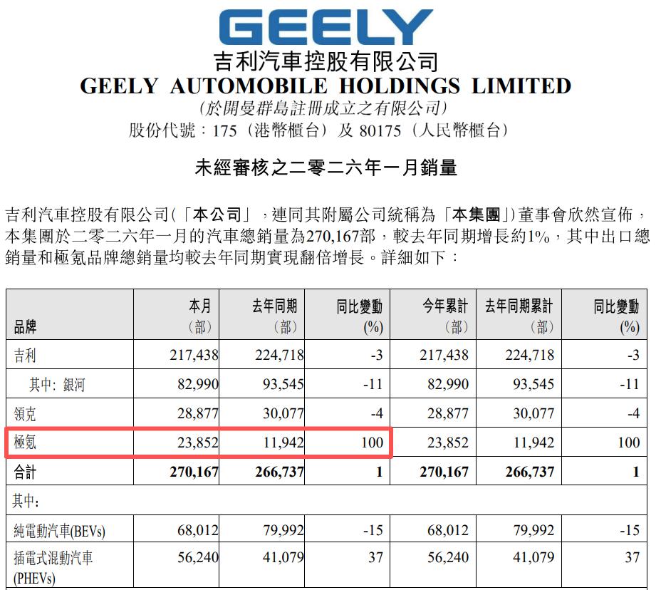 产销数据显示,吉利旗下高端智能电动汽车品牌极氪,2026年1月销量同比增长100%至2.39万辆。据业内人士透露,2025年9月上市的极氪9X在2026年迎来销量爆发,单月销量超1万辆。