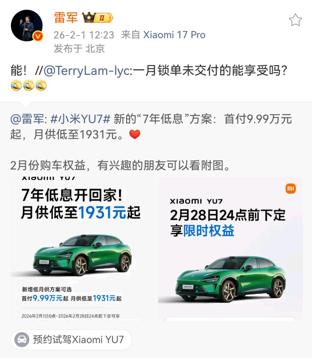 2026年2月1日,雷军通过微博发布小米汽车新的“7年低息”方案,首付9.99万元起,月供低至1931元。