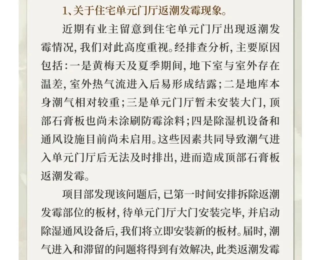 记者注意到,去年8月港城房产曾在公开回复中提到,住宅单元门厅返潮发霉是因黄梅天及夏季地下室与室外温差大、地库潮气重、单元门厅未装大门且顶部石膏板未涂防霉涂料、除湿通风设备未启用等,公司已拆除返潮发霉板材,待大门安装及设备启动后将安装新板材,问题会得到解决。