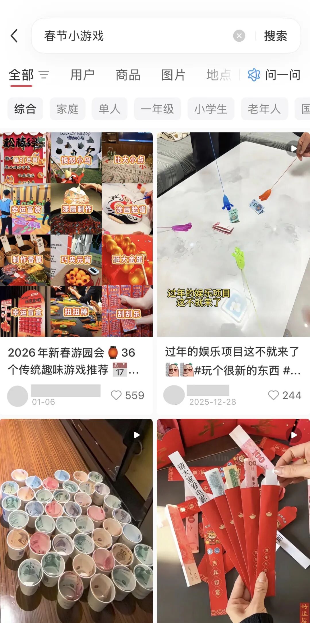 小红书上,“春节小游戏”词条浏览量达81.4万。相关笔记里,年轻人分享着各式创意玩法:家庭版“你画我猜”、春节知识竞赛、年夜饭接龙挑战……评论区满是“今年就这么玩”“已收藏”“过年终于有盼头了”的反馈。