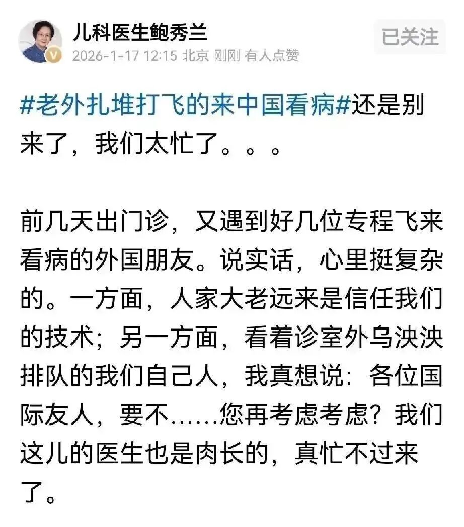 大量外国人来华就诊让部分医院增收,但也给顶级医院带来压力。1月17日,北京协和医院儿科专家鲍秀兰主任坦言:“还是别来了,我们太忙了!”