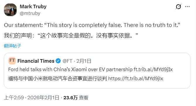 福特方面表示:“这个报道完全是假的,毫无事实根据。”福特汽车首席通信官马克·特鲁比(Mark Truby)也在社交平台发帖辟谣。
