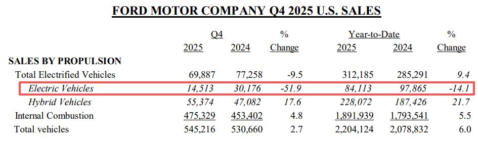 去年第四季度,福特纯电车销量下滑尤为严重,从2024年Q4的3万辆降至1.45万辆,近乎腰斩。