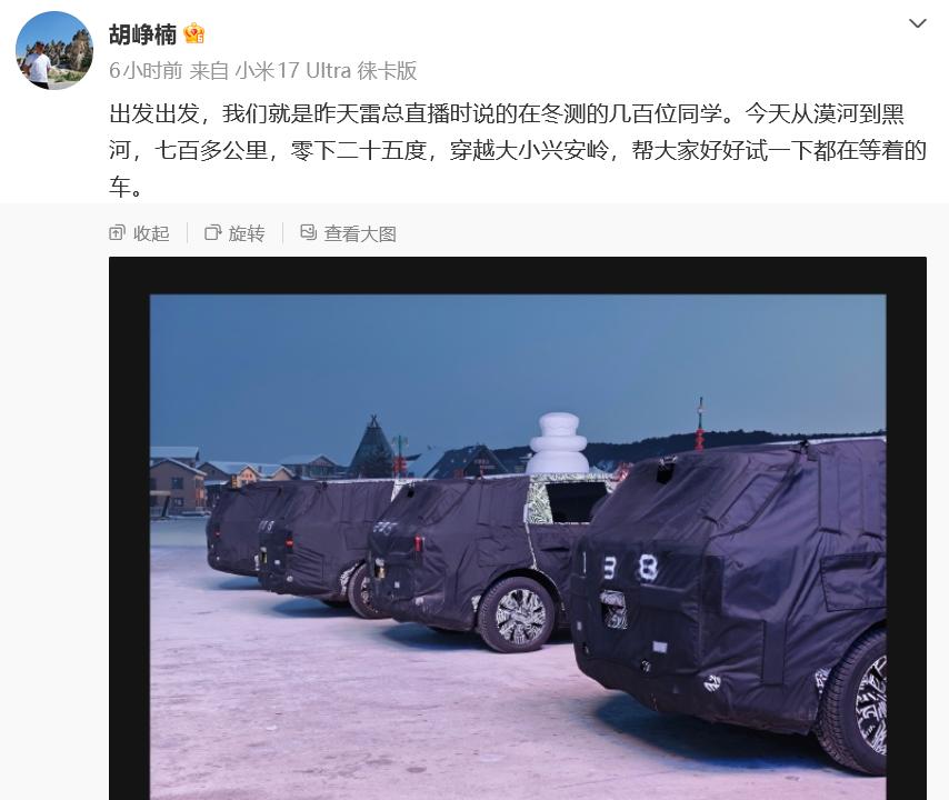 小米从吉利研究院挖来的院长、小米汽车“关键人物”——胡峥楠,刚发微博晒出一组伪装测试车的冬测图。