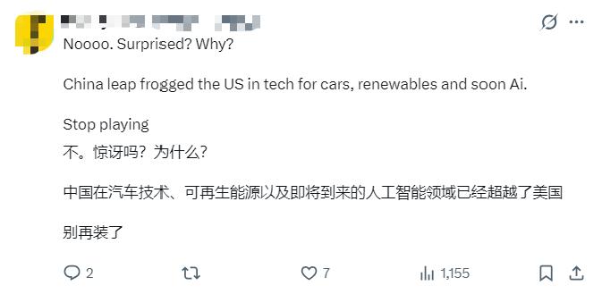 辟谣后,有网友感到遗憾或不解,认为中国在汽车技术、可再生能源等领域已超越美国: