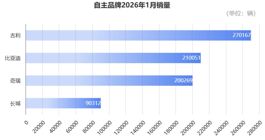 吉利以27万台月销量登顶,同比增长1%;之前的“一哥”比亚迪位次变动,1月销售21万台,同比下滑30.11%。