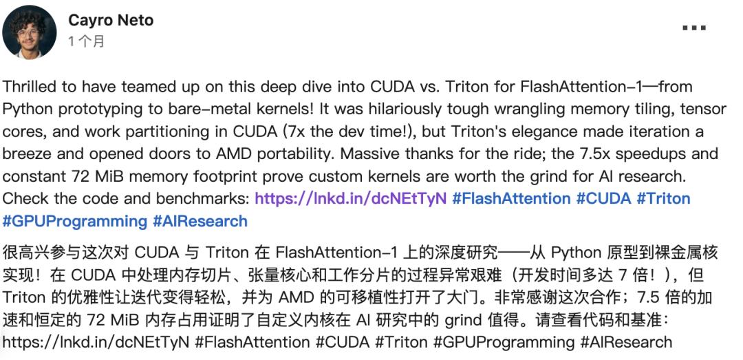 据开发者测试,在Transformer注意力内核等场景中,使用Triton编写的代码量比CUDA减少75-90%,性能却能与CUDA媲美,部分场景甚至超出5-37%。
