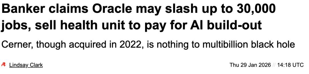2026年1月,投行TD Cowen的报告引发硅谷震动:甲骨文正推进大规模裁员计划,涉及2万至3万人,占员工总数超20%。看似“瘦身”,实则是为AI算力项目输血。