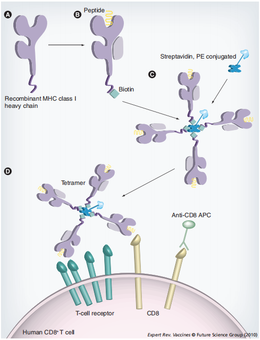 MHC四聚体的构建一般包含以下步骤:抗原肽制备、生物素化、四聚化以及荧光标记。