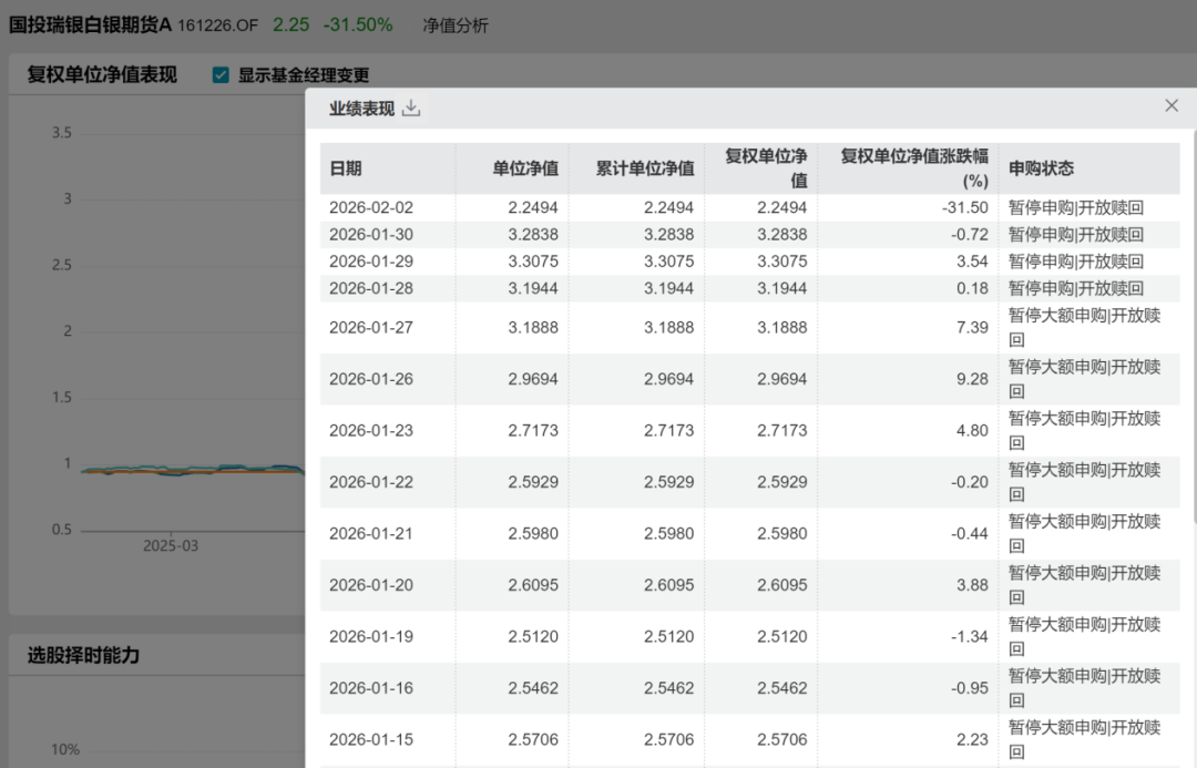 举个简单的例子:假设国际银价下跌了30%,但由于受到17%跌停限制的影响,上期所白银期货价格仅下跌了17%。如果基金继续按照上期所白银期货下跌17%的价格来估值,那么基金的净值就会“高估”实际的资产价值,形成所谓的“估值滞后”。这种偏差意味着,基金账面显示的净值已经不能准确代表其所持资产的真实价值了。