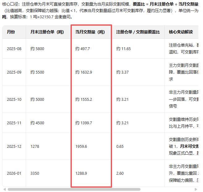 2025年8月至2026年1月,COMEX白银交割量持续突破历史极值:10月非主力月交割1555.2吨,较往年同期激增10倍;12月主力月交割1959.6吨(6300万盎司)创下纪录;2026年1月淡季仍交割1288.9吨(4144万盎司),同比暴涨300%。