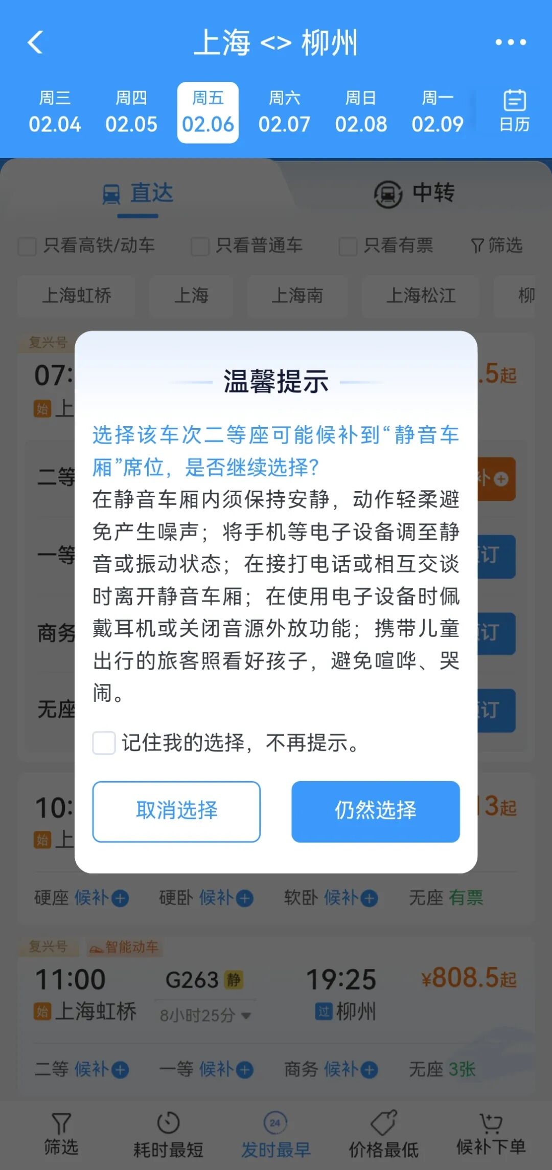 12306车票选项新增“静音车厢”服务(高铁和动车除动卧外),选择后乘客需遵守静音约定,适合长途出行。