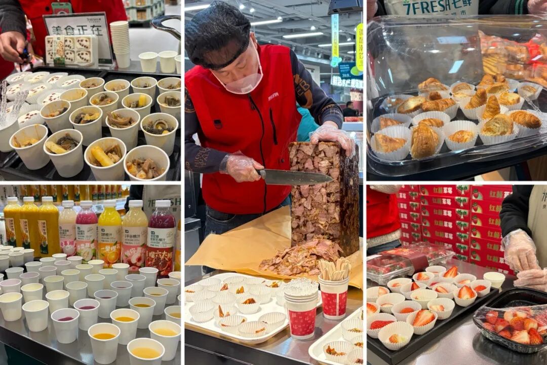 不同于山姆需会员费才能进店试吃试喝,京东七鲜新开门店设置了30~40个试吃点位,提供大份量试吃(如整块蛋糕),任何人都可进店免费“试吃到饱、试喝到够”。