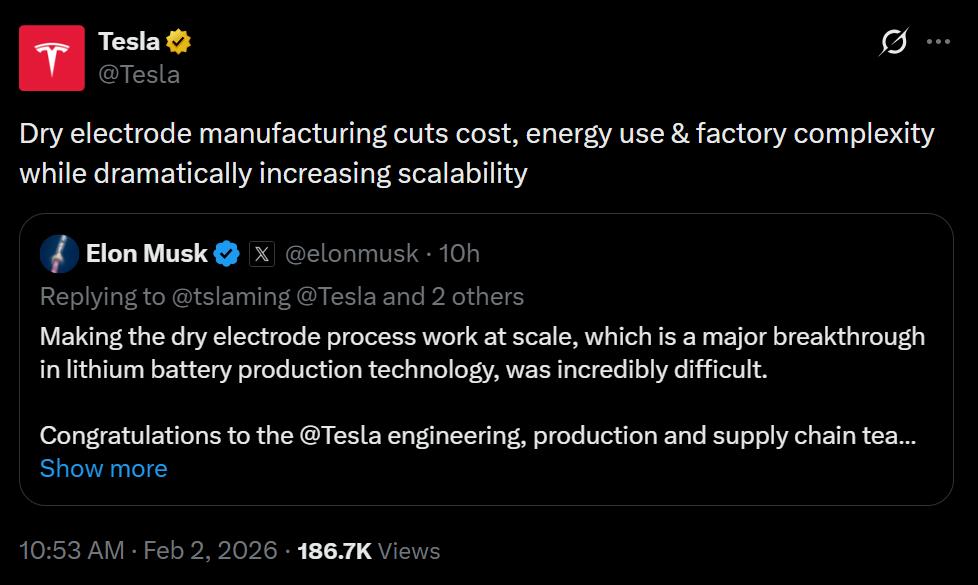 特斯拉官方团队随后转发该消息并补充:“干电极制造工艺能够降低生产成本、能源消耗与工厂复杂性,同时大幅提升生产可扩展性。”