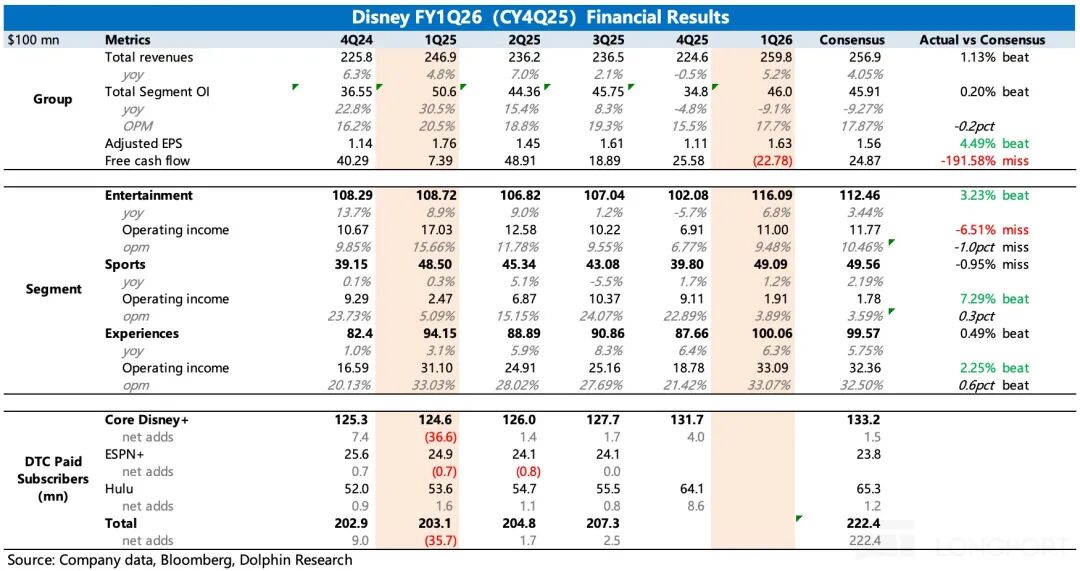1. 整体业绩符合预期,利润略超市场预估:一季度迪士尼总营收达260亿美元,同比增长5%;经营利润为46亿美元。由于市场此前已对内容销售、流媒体及体育板块的利润下滑有所预期,因此最终利润同比减少并未构成重大利空。